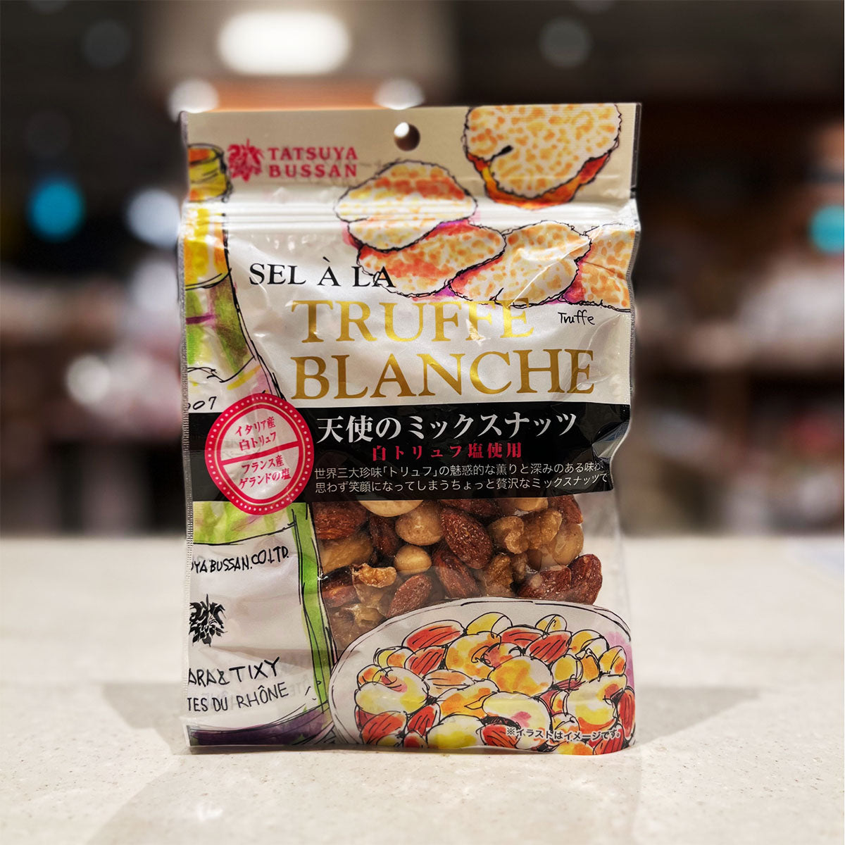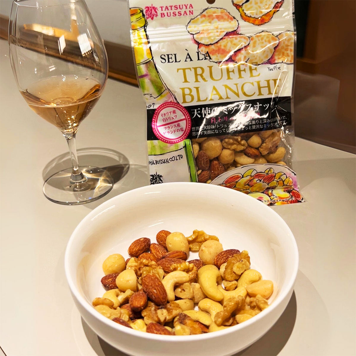イタリア・ピエモンテ産の最高級白トリュフとフランス・ブルターニュ産のゲランドの塩で味付けした超贅沢なミックスナッツ!ナッツはアーモンド、カシューナッツ、マカダミア、クルミの四種類。トリュフの魅惑的な薫りと深みある味わいで思わず笑顔になってしまう贅沢なミックスナッツ!