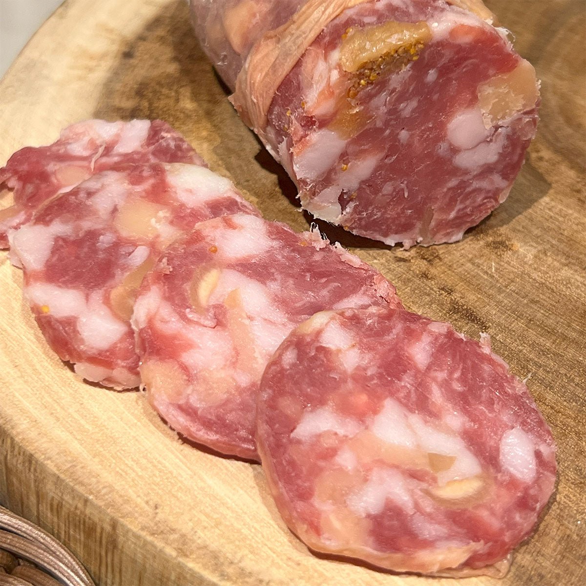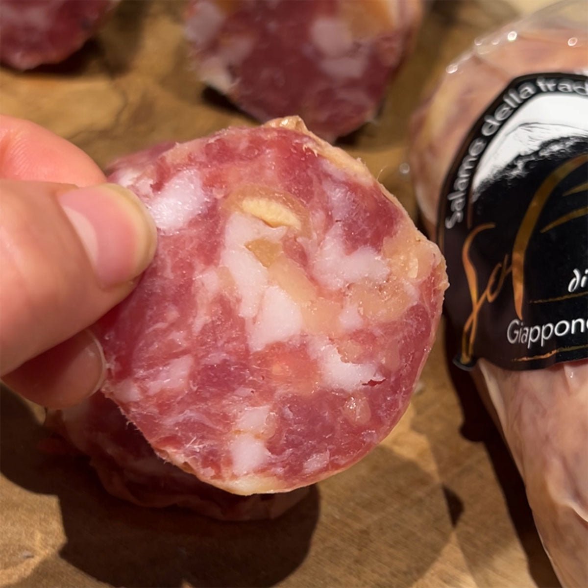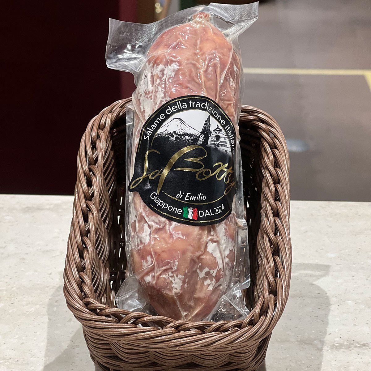 イタリアを象徴するパルミジャーノ・レッジャーノにドライ無花果とヘーゼルナッツを練り込んだ贅沢なサラミ。甘みとコク、ナッツの香ばしさが重なる奥深い味わいは、まさにイタリアの食卓をそのまま再現した逸品です。粗挽きの国産豚肉を使い自然発酵と熟成で仕上げることで、しっとりとした食感と旨味が際立ちます。古屋社長が「エミリオ君」と呼ばれるようになったのはイタリア文化への深い愛着から。仲間内では「もう日本人じゃないね」と笑われるほどイタリアの食文化に心酔。そんな情熱がこのサラミに詰まっています。