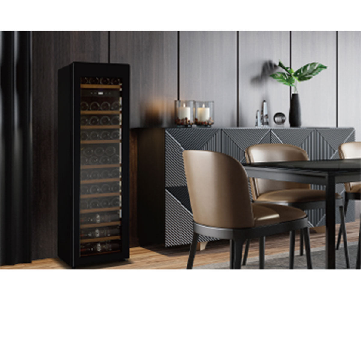 「日本の気候や居住環境に適したワインセラーを世に出したい」。本質的な原点に回帰し、一から設計、基幹部品については自社で選定を行い独自の厳格な試験方法により品質目標を達成し、安心してワインを保管できる信頼性を実現。空間に調和するデザインや省エネ性の高いインバーターコンプレッサーの搭載など、ワインラヴァーの皆様に寄り添うワインセラー、それが「Essential(エッセンシャル)」シリーズです。扉面の角は丸みを帯びたラウンドデザインと木製飾り棚の柔らかい印象でインテリアになじみ、庫内手前側の両サイドに配置されたバータイプのLED照明が、自慢のワインコレクションを美しく照らし出します。FJE-113GS(BK)には暖色系のLEDを、FJE-113GS(WH)には寒色系のLEDを搭載することで、デザインの統一感を演出。インバーターコンプレッサーは周囲の状況に応じて、時にはパワフルに、時にはやさしく効率的に冷却に必要な回転数を制御するため、エネルギー費の高騰が叫ばれている現在において、省エネ性と静音に効果を発揮します。